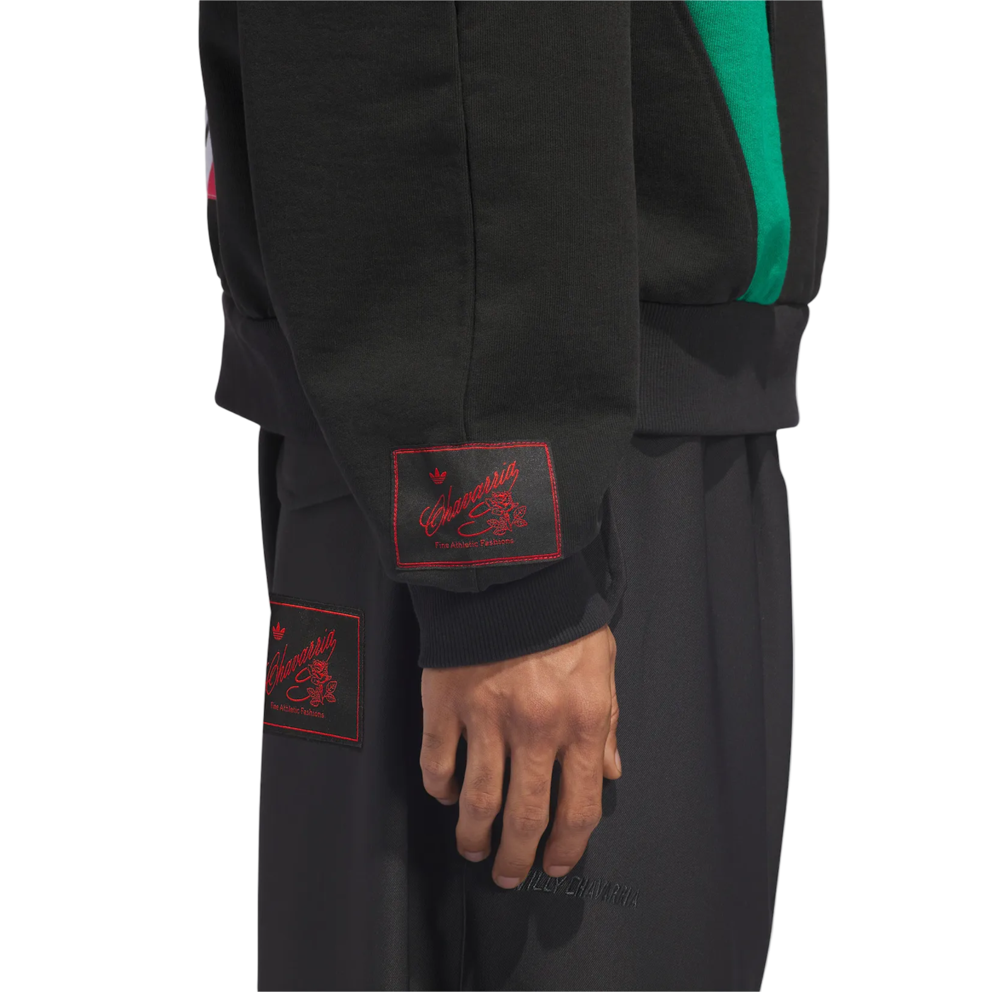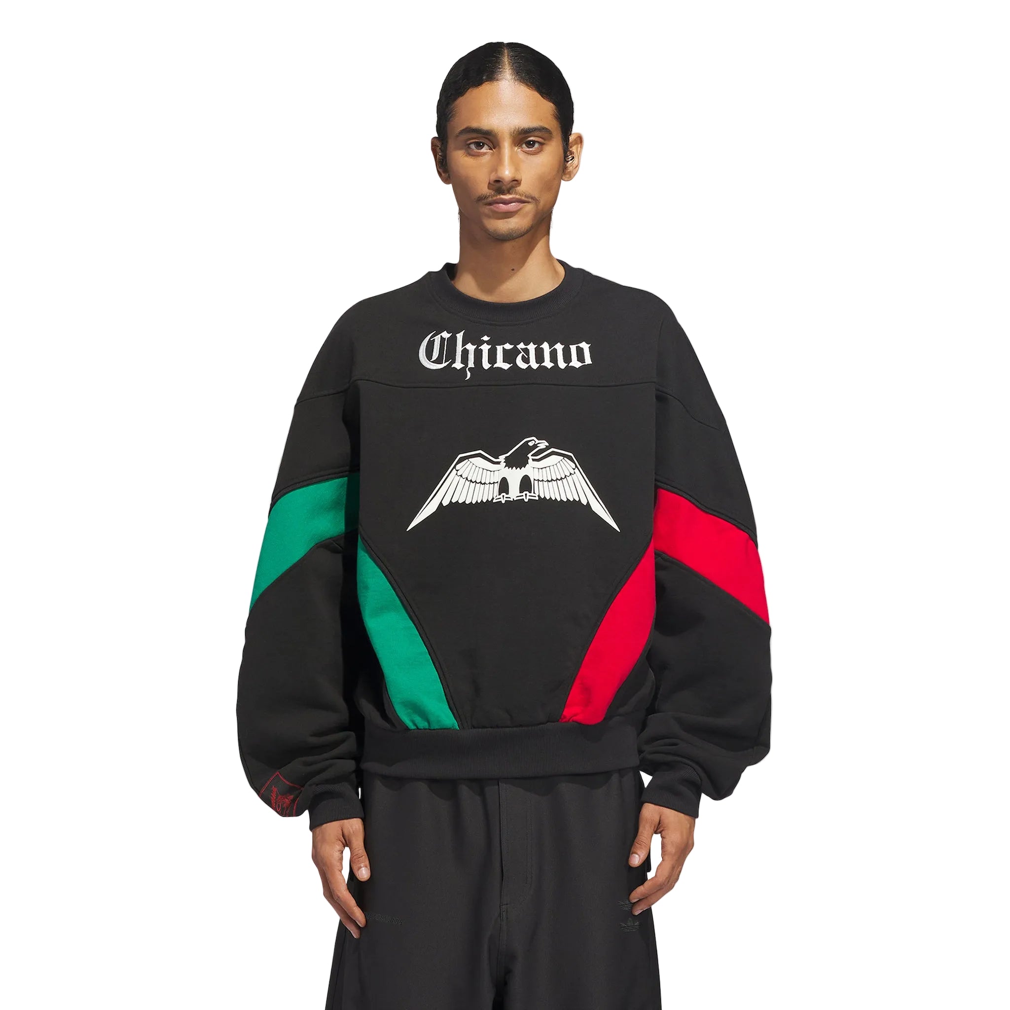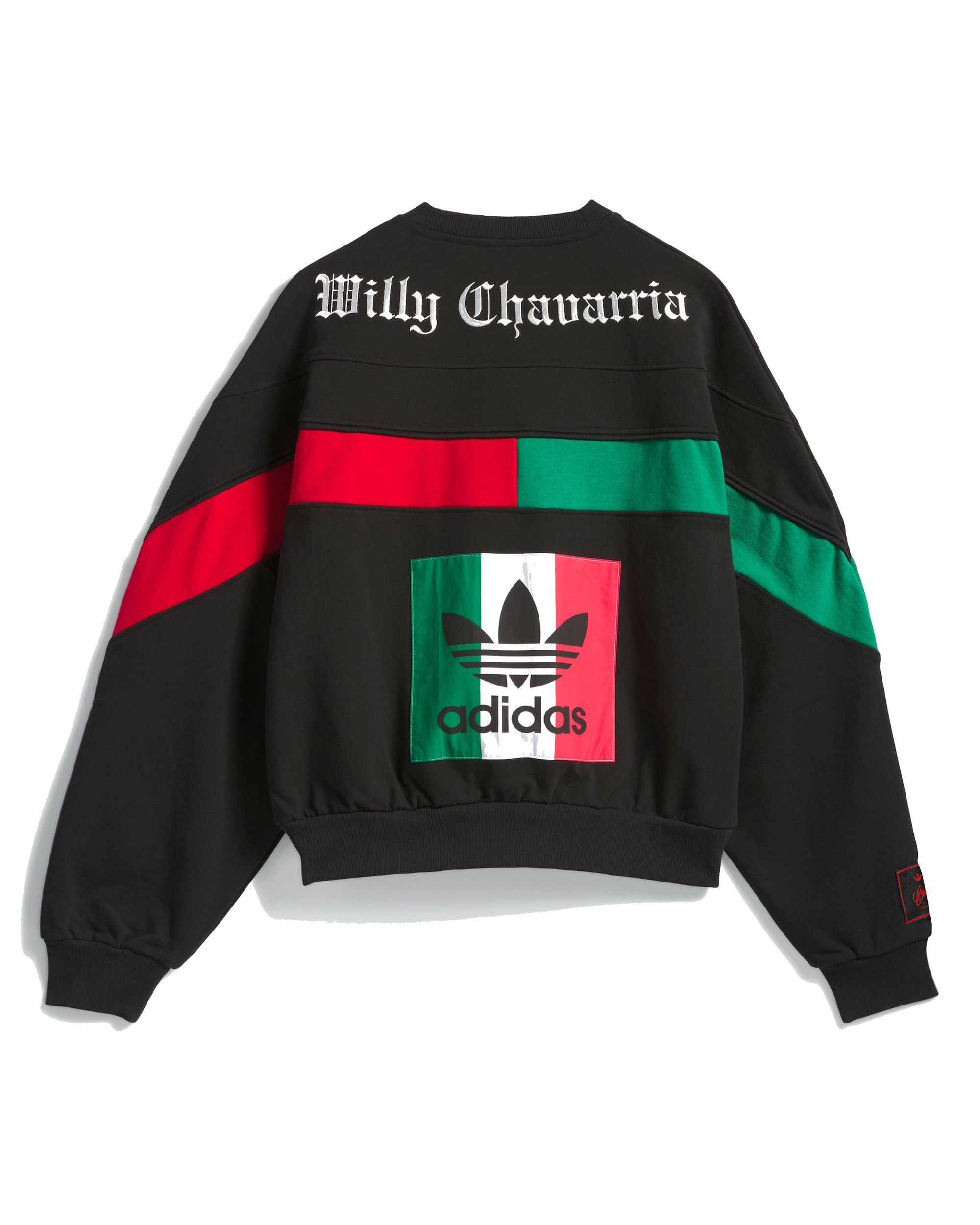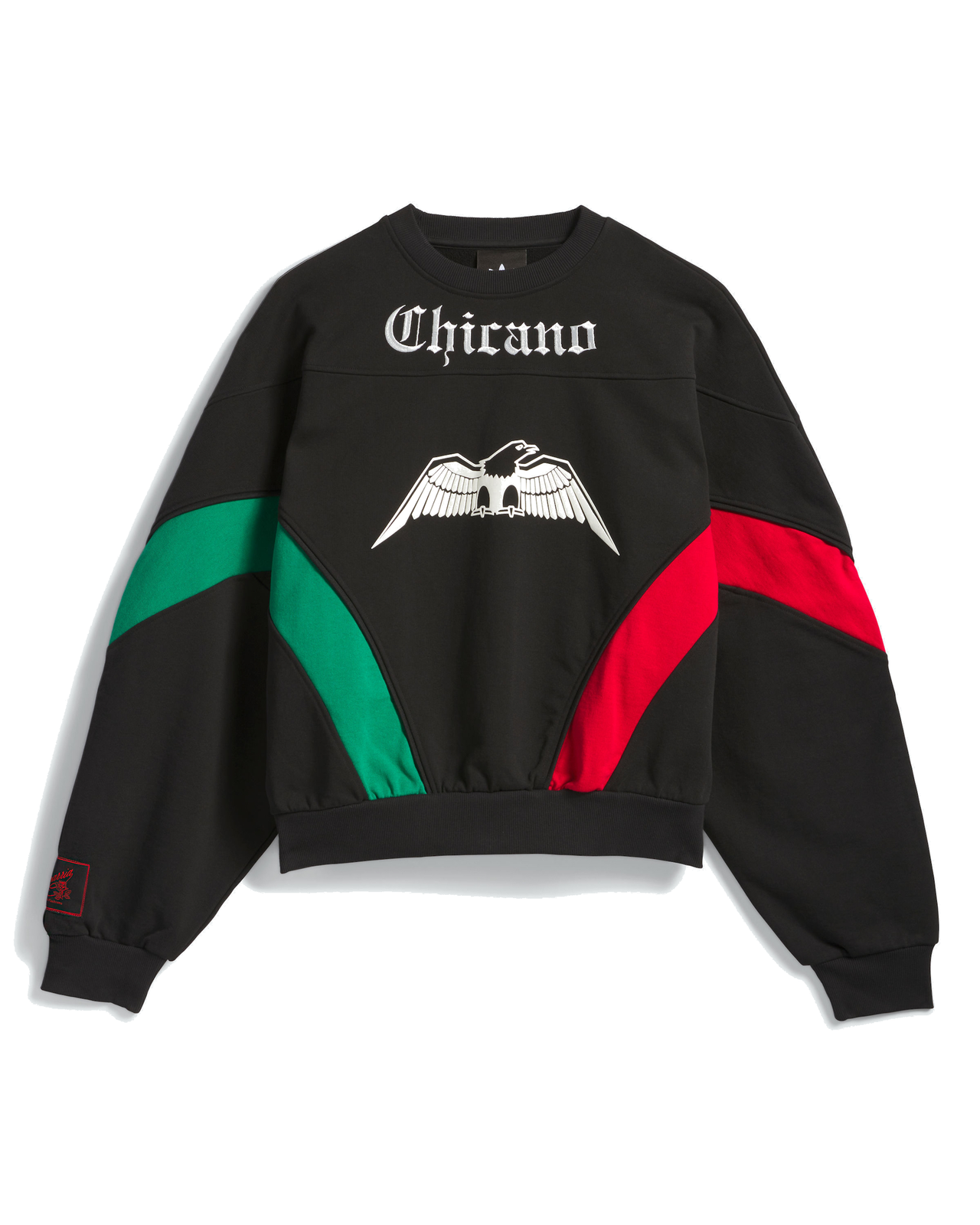 The Chavarria Chicano Sweatshirt is elevated in heavy cotton french terry fabric with a washed finish to provide maximum comfort and wearability. The sweatshirt is designed with voluminous proportions in the arms and body. Functional details include a ribbed waistband, collar and cuffs, along with piping inserted between the panels for subtle structure. Branding is symbolized by an embroidered "Chicano" wordmark and print puff eagle on the center front chest, an embroidered "Willy Chavarria" wordmark on the back and a woven applique featuring stacked Trefoils and a Mexican flag. A woven Willy Chavarria jocktag is applied on the wearer's left sleeve.