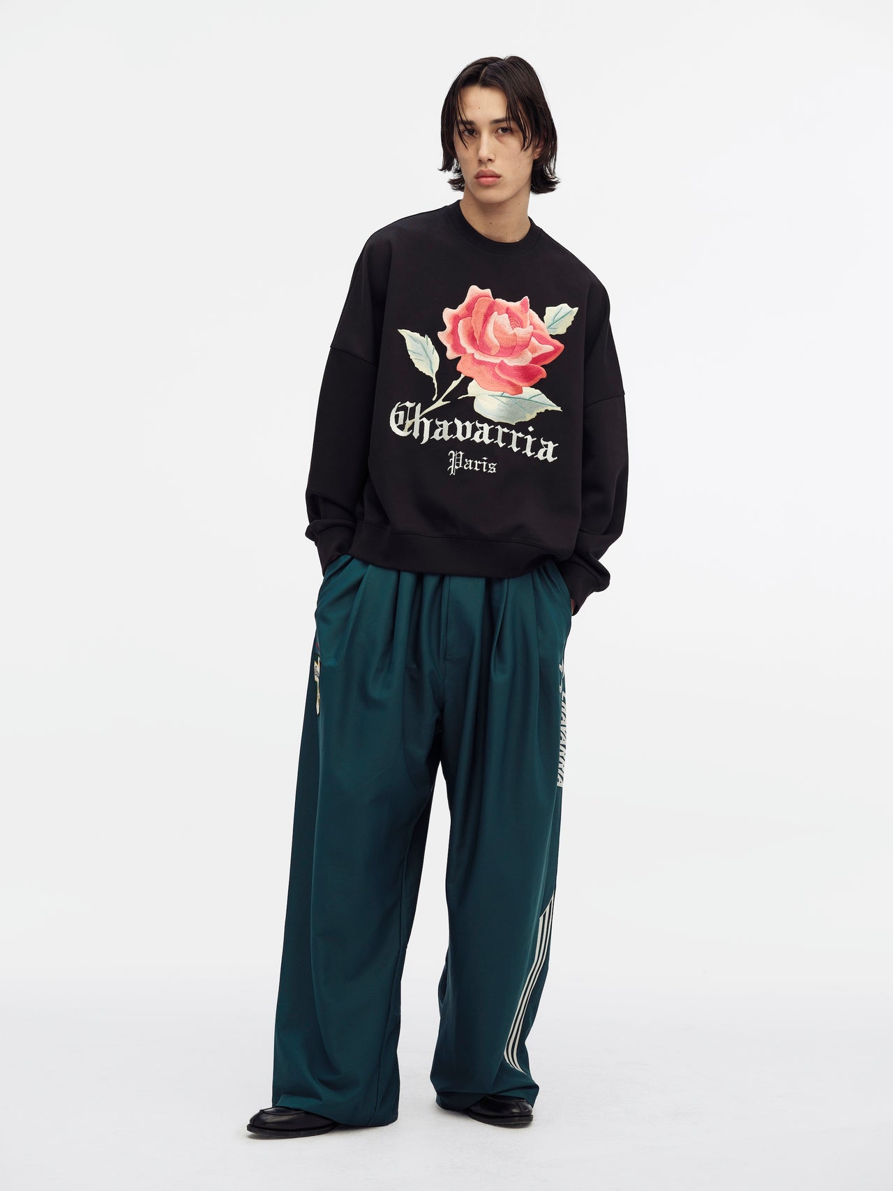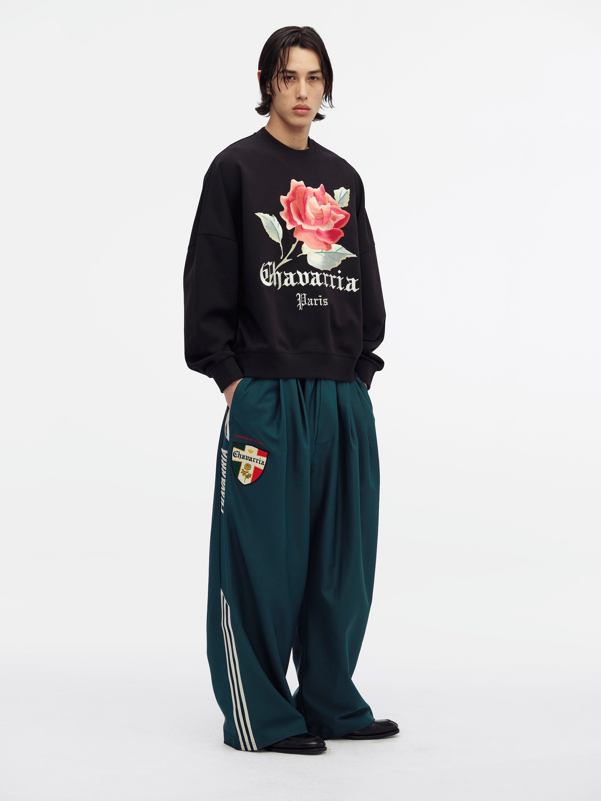 The Adidas x Willy Chavarria Crew Sweatshirt features a classic crewneck silhouette with 2x2 rib at the collar, cuffs, and hem for structure and comfort. Detailed with embroidered double Trefoil logos on the lower left sleeve and an embroidered rose graphic centered on the chest, this sweatshirt balances elevated branding with everyday wearability.