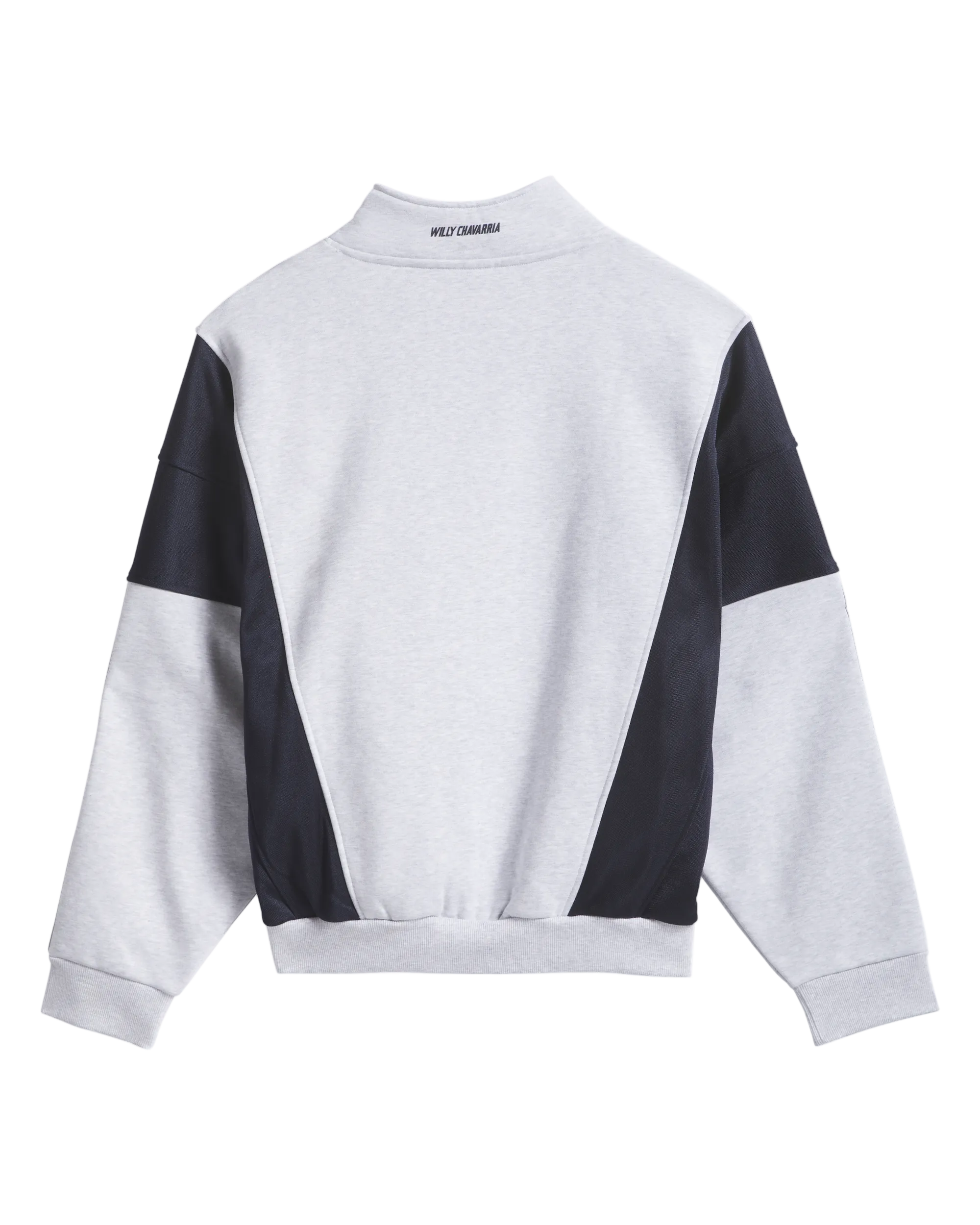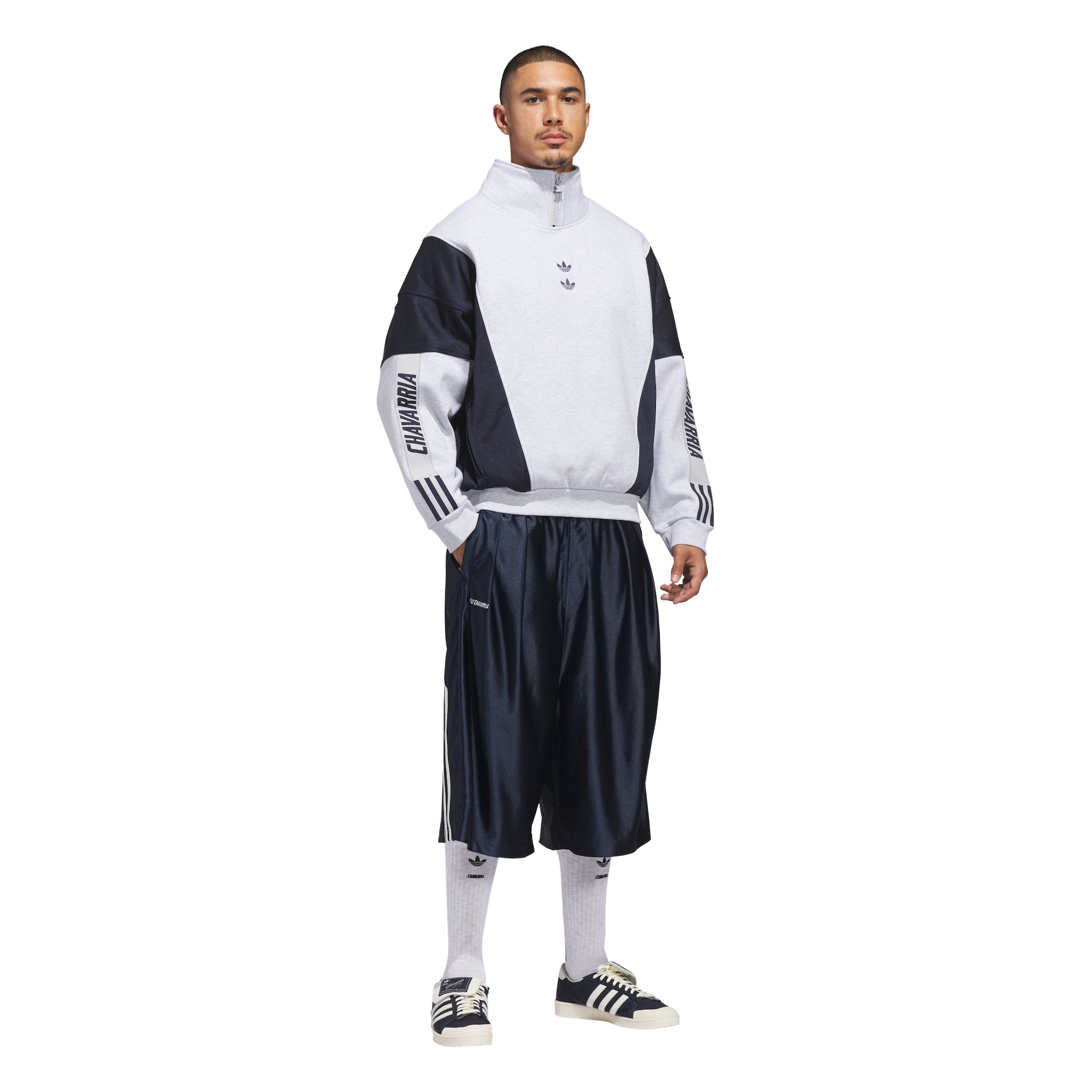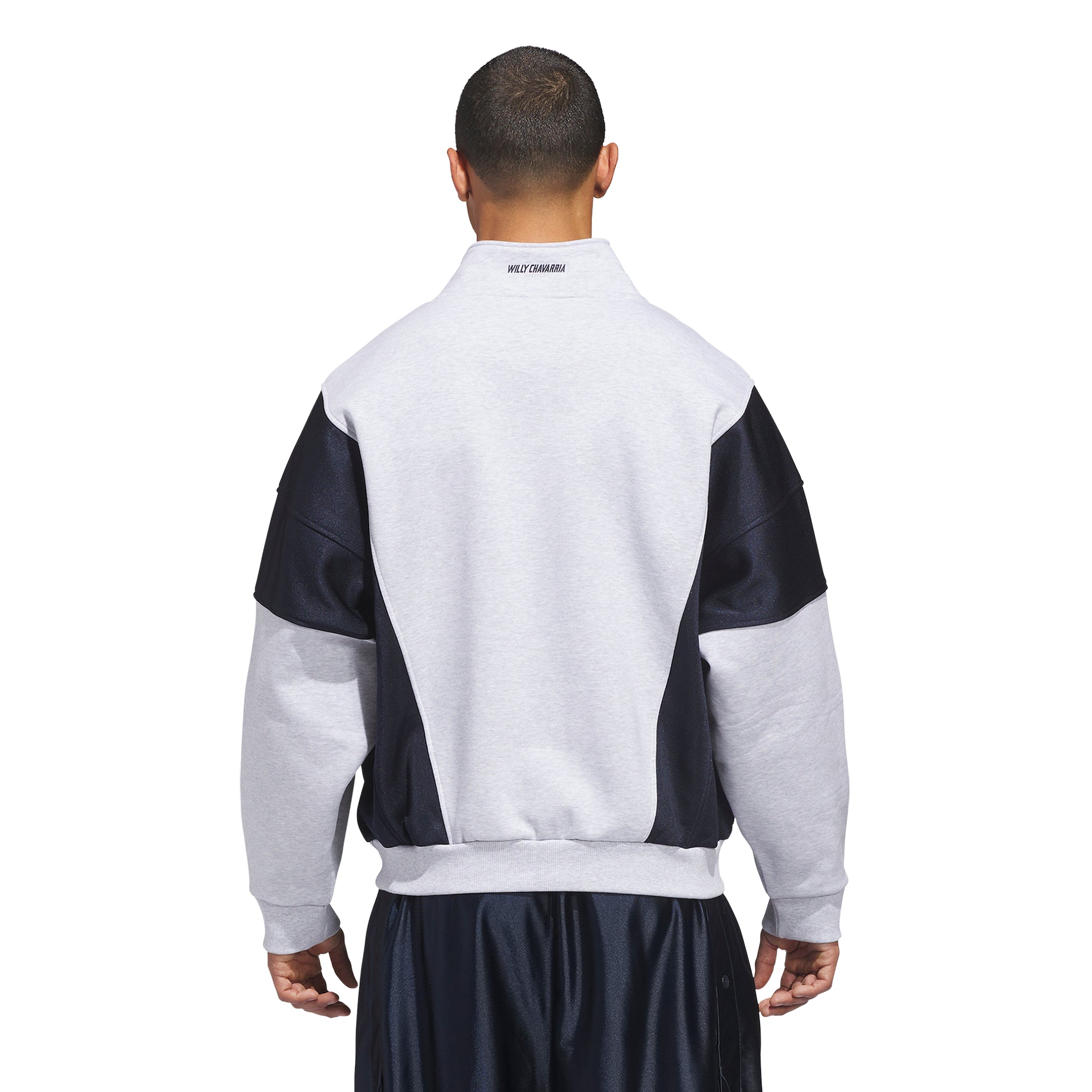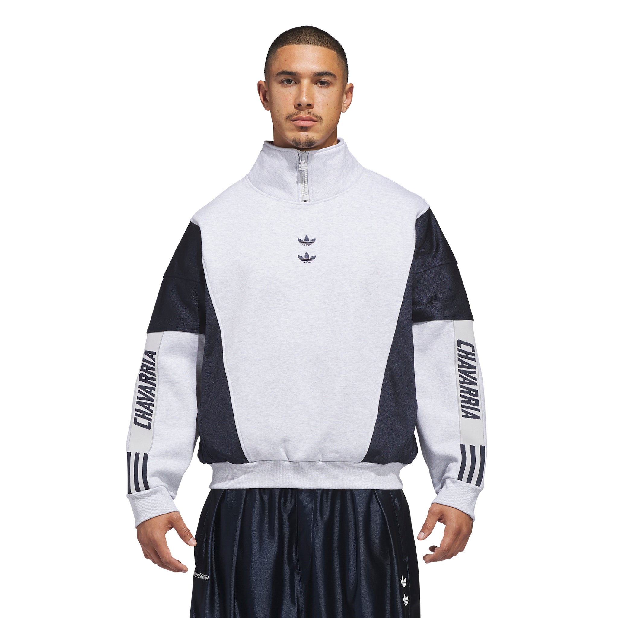 The Chavarria Mockneck is elevated in a heavy cotton fleece mixed with shiny fleece material to provide maximum comfort and wearability. The mockneck is designed with voluminous, oversized proportions throughout the body and sleeves. Functional details include front zip pockets, rib cuffs and hem, and a stand collar with a zip closure. Branding is symbolized by stacked double embroidered Trefoils at the center chest and a high density "Willy Chavarria" print on the back collar. Adidas 3 stripe combined with Chavarria taping are placed along the lower arms.