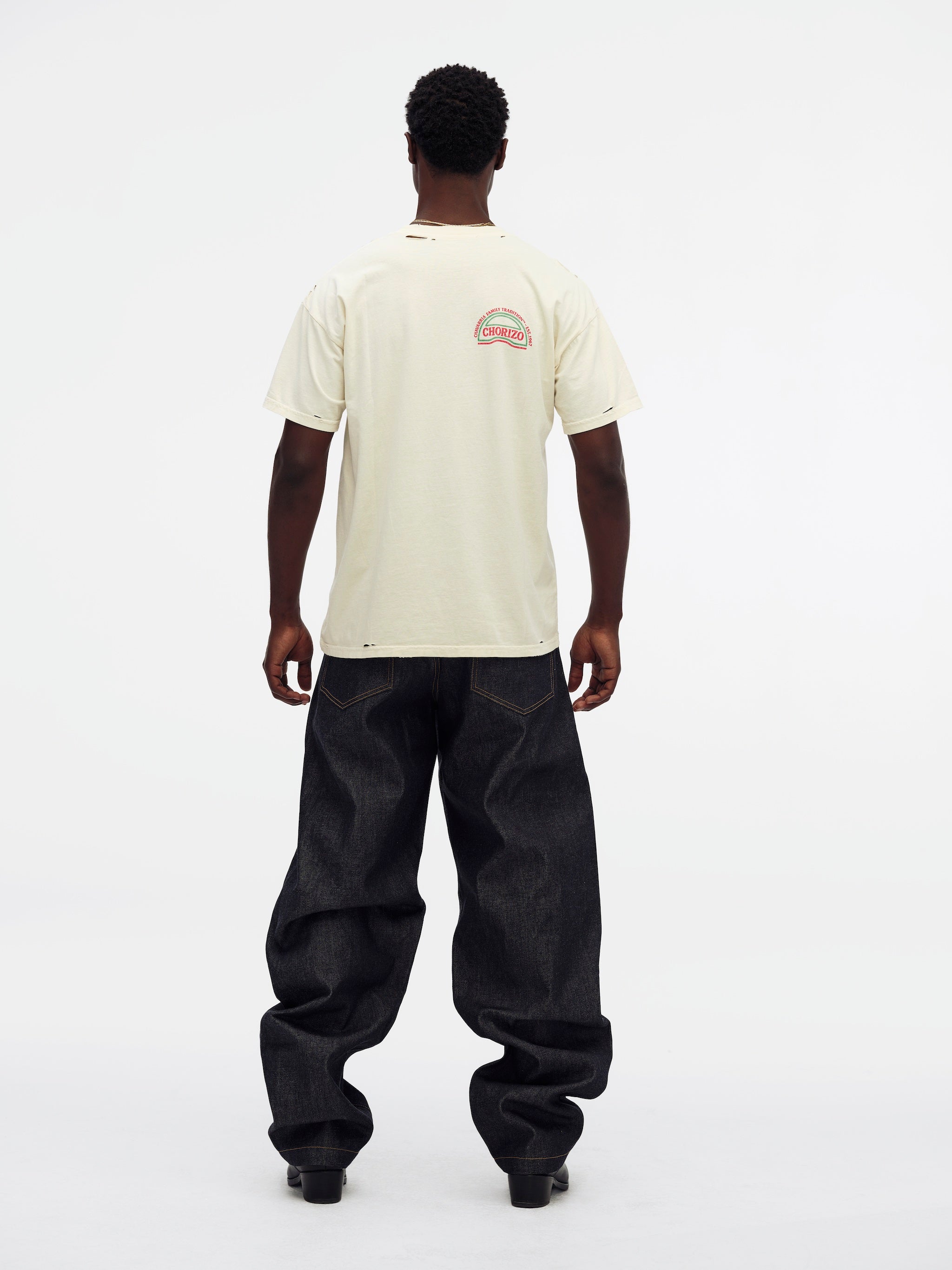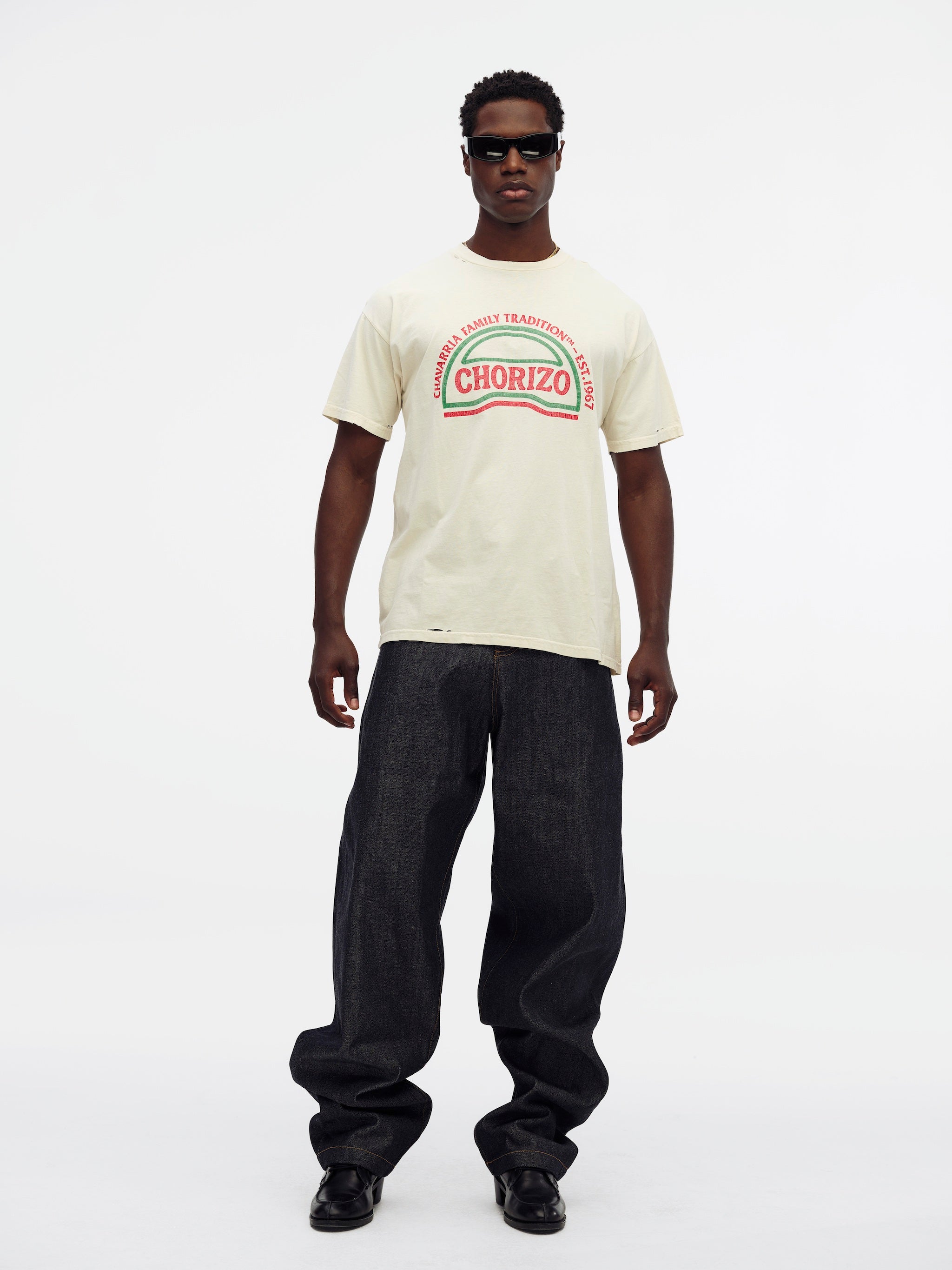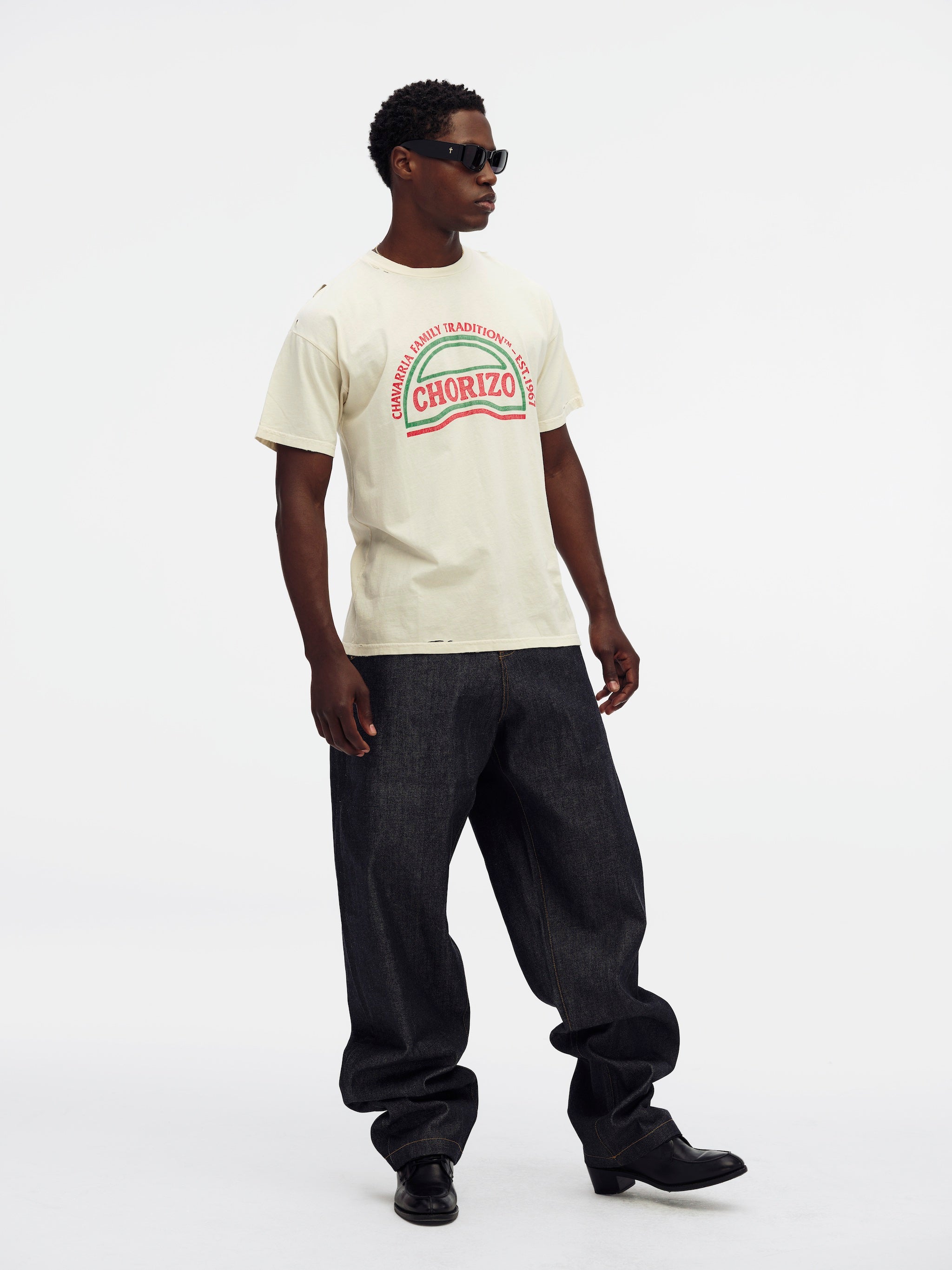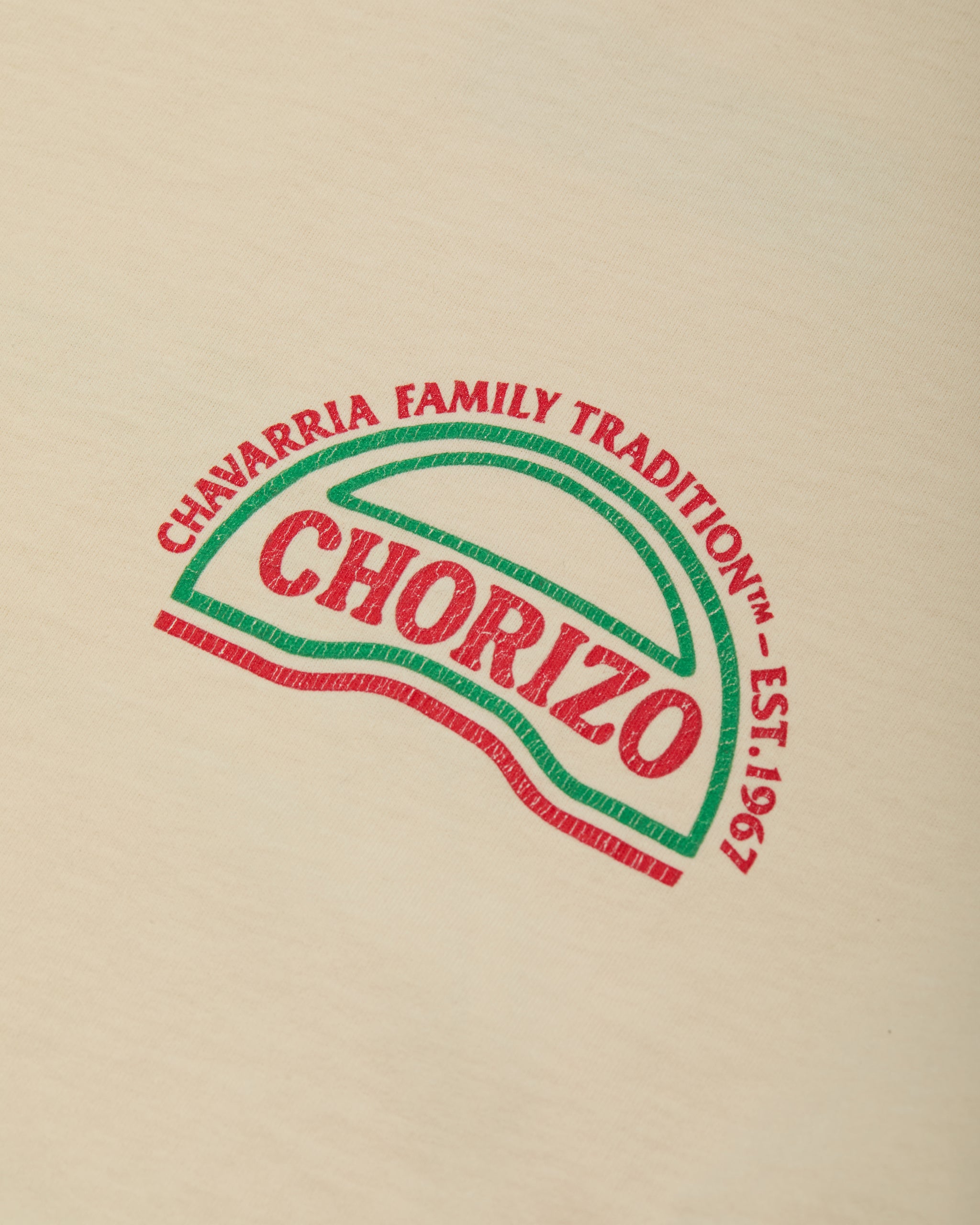 The Chorizo - Easy Tee offers a relaxed, effortlessly worn fit. Crafted from 100% cotton, it feels soft and breathable, with subtle distressed holes at the collar, sleeves, and along the lower hem for added character. Finished with a vintage-style CHORIZO graphic at the chest, featuring the Chavarria Family Tradition™ Est. 1967 mark, this tee is designed to feel lived-in from day one. Perfect for layering or wearing on its own, it fits true to size.