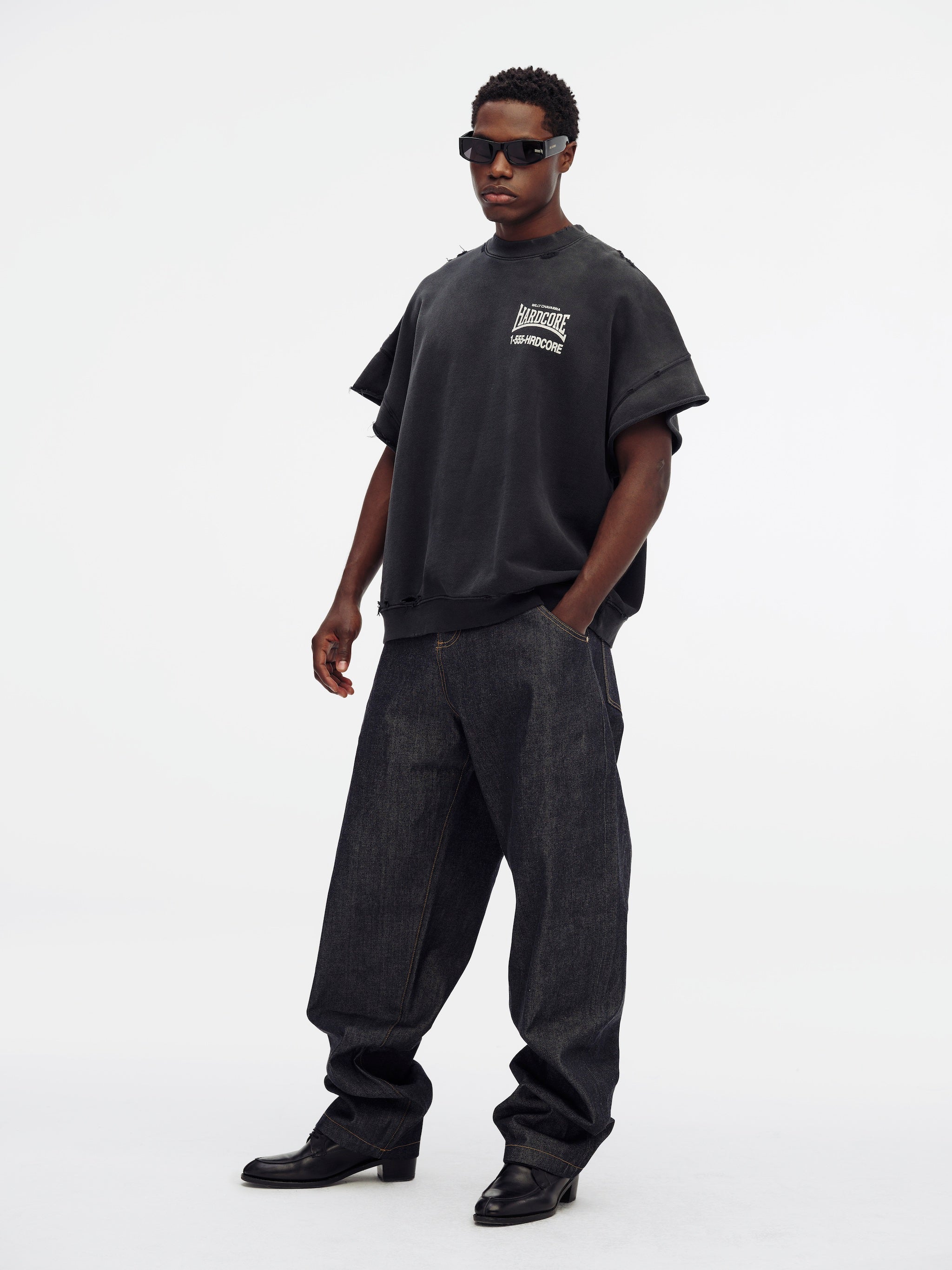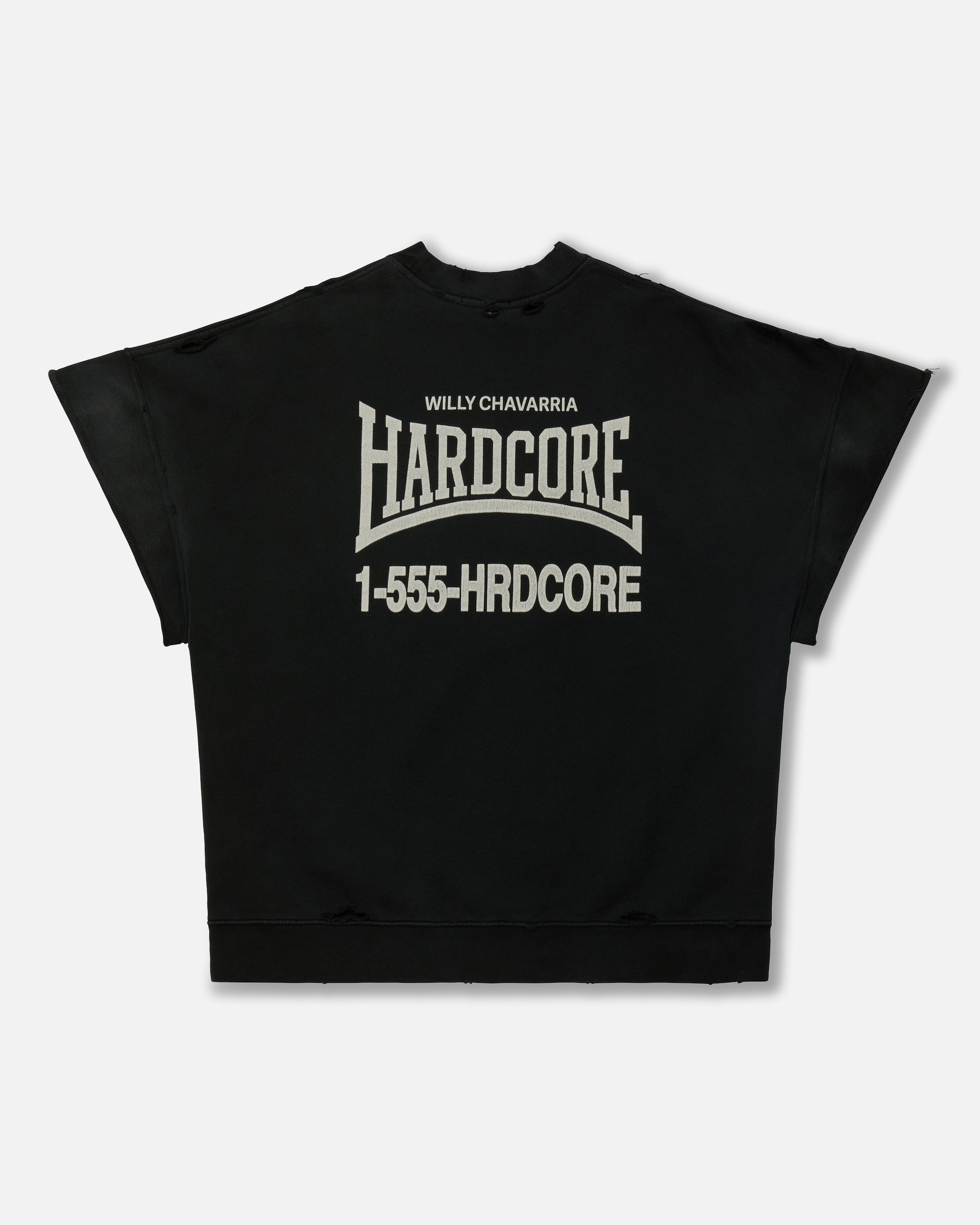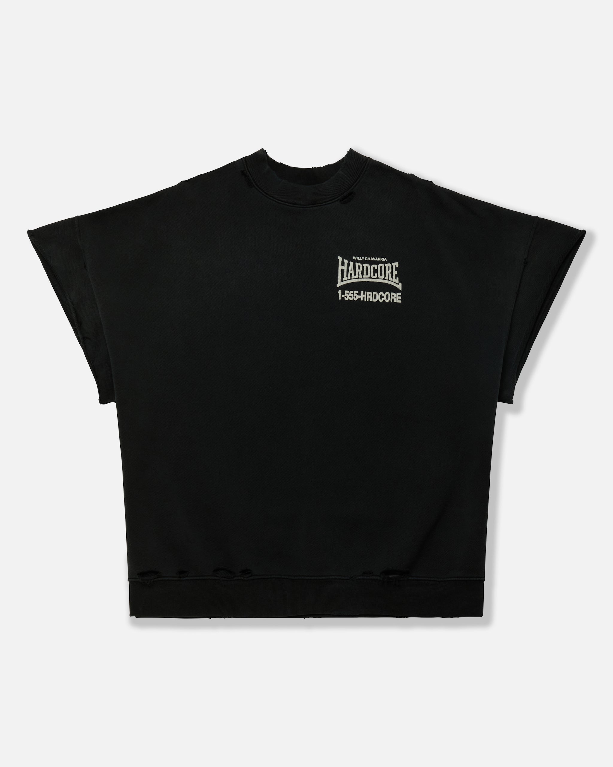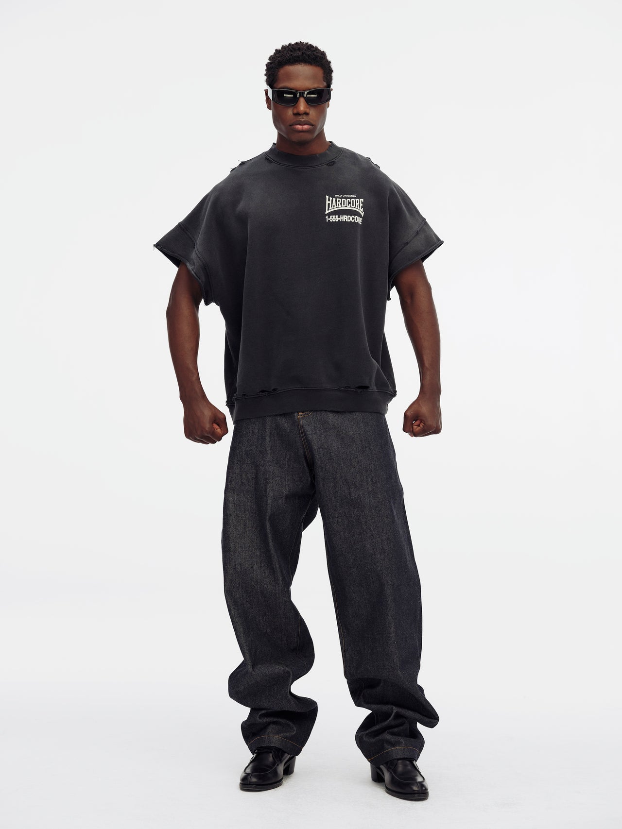 The "Hardcore" - Muscle Tee has a cropped, oversized boxy fit with a drop-shoulder silhouette for an effortlessly cool look. Crafted from 100% cotton, it feels soft, breathable, and comfortable for all-day wear. Finished with intentional distressing at the collar, sleeves, and hem, and a Hardcore graphic printed at the chest, this tee delivers a worn-in feel with bold attitude.