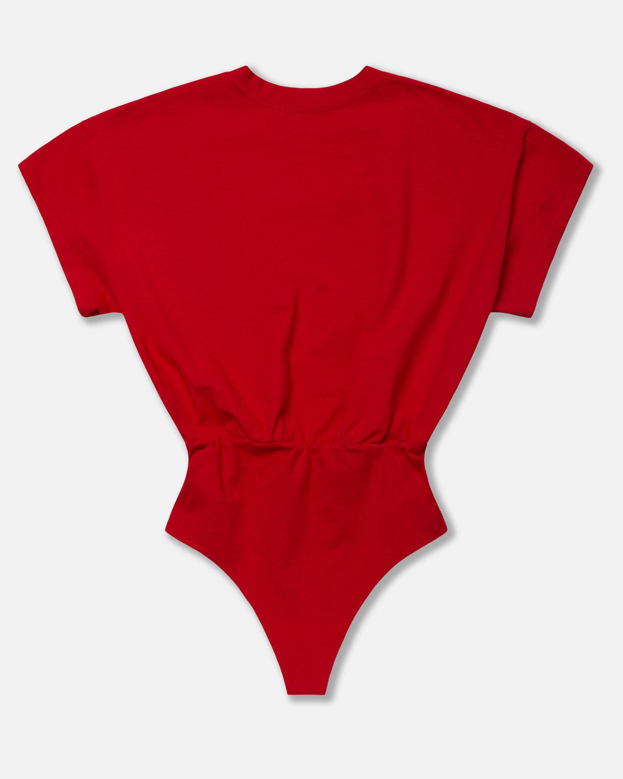 The Her Pleasure Stiletto Bodysuit features an oversized blouson fit with a ribbed neckline and cap sleeves for effortless comfort. Designed with a cheeky bottom and snap closure, it provides a secure, flattering fit. Crafted from 100% cotton, it feels soft, breathable, and comfortable for all-day wear.
