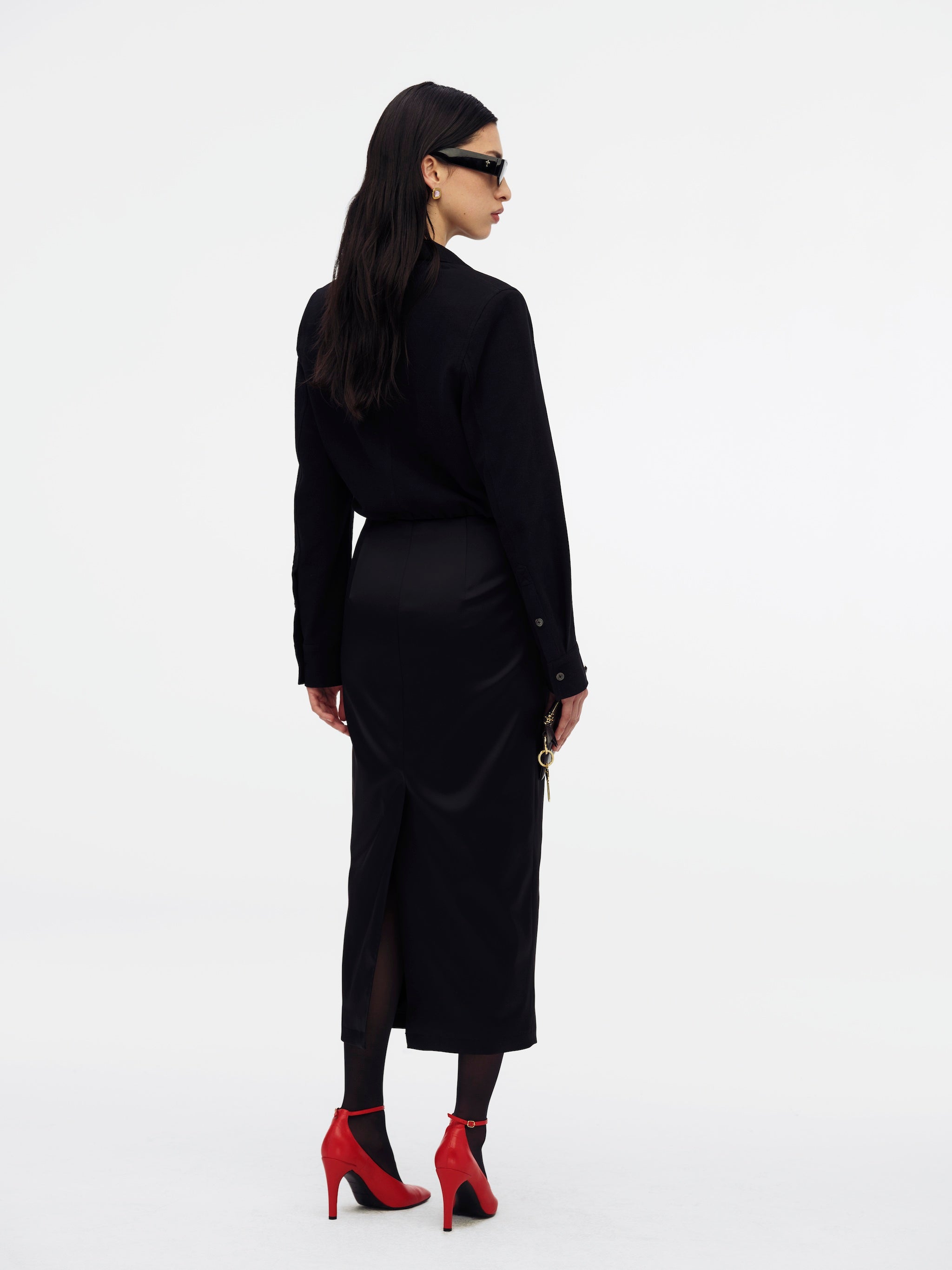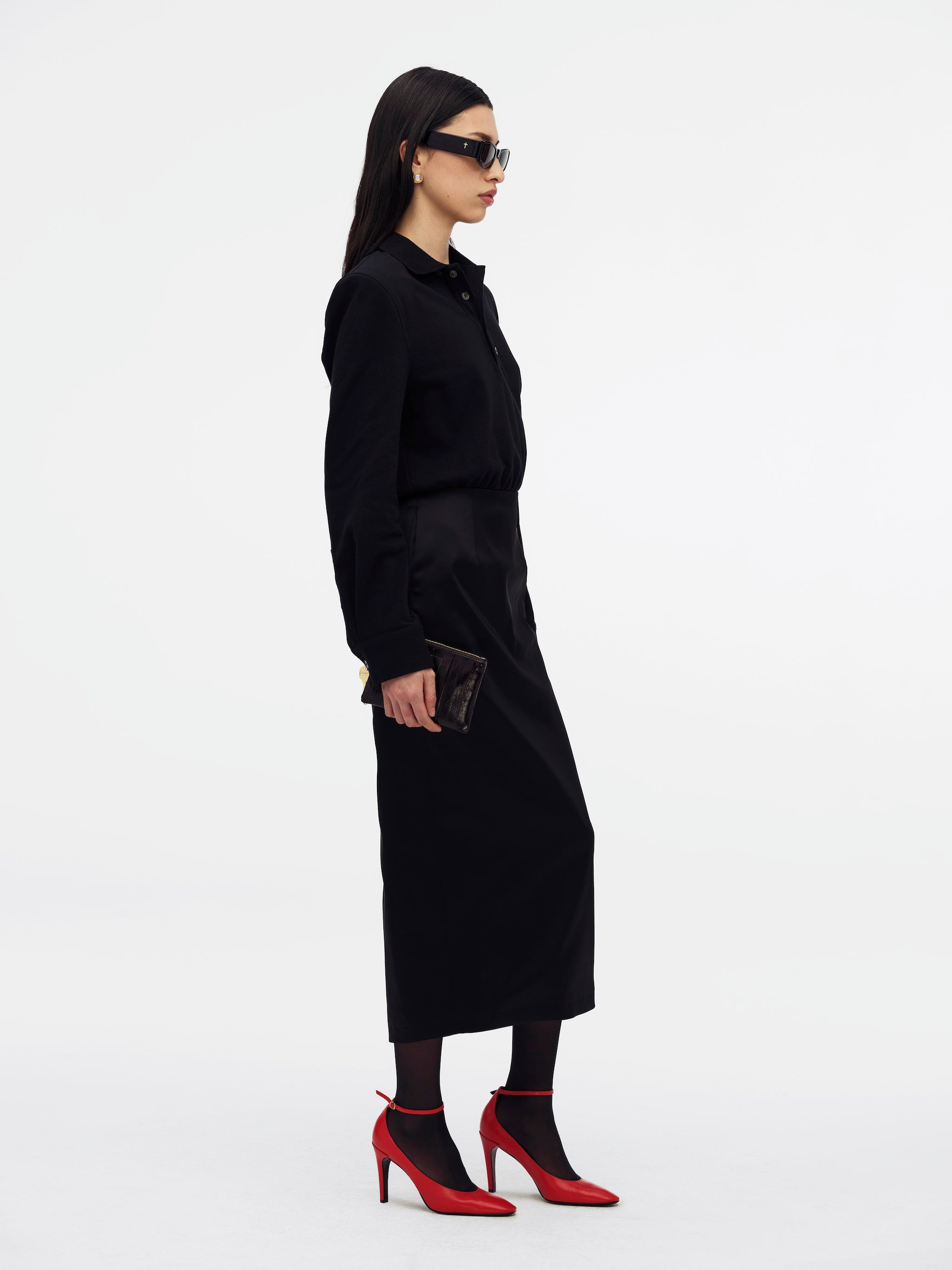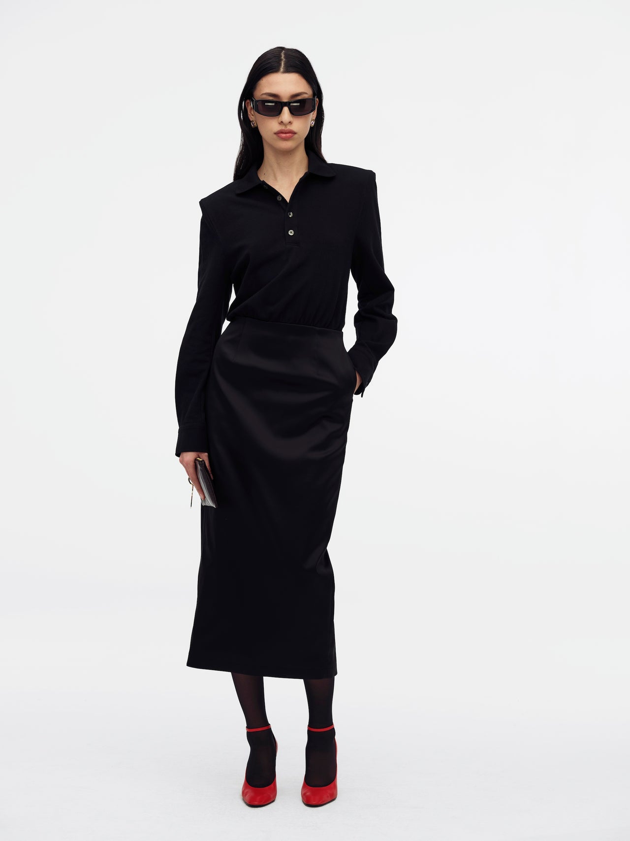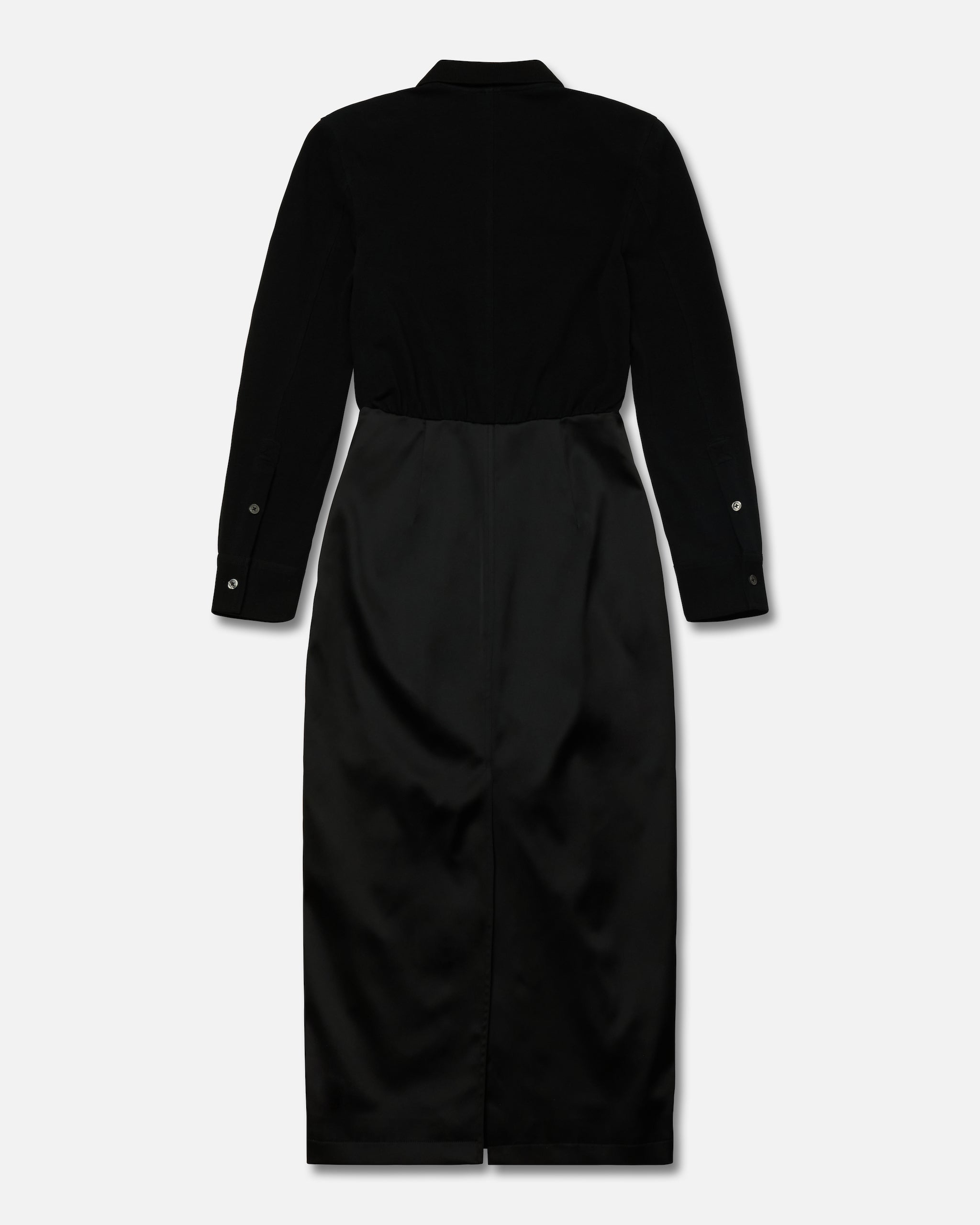 The Polo Dress features a structured yet flattering fit with a shirred waistband and padded shoulders for subtle shape. Designed with a collared neckline, front and back darts from the waistline, and a back slit, it blends classic tailoring with modern detail. Branded faux horn buttons at the center front closure, buttoned sleeve cuffs, and convenient side seam pockets complete the look. Straight hem. Fits true to size.