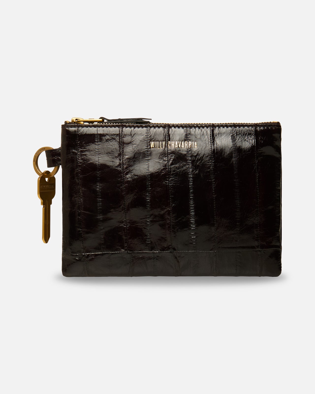 The Secreto Pouch is crafted from cow leather with a naturally crinkled, high-shine finish that gives each piece a distinct, lived-in character. The compact silhouette is secured with a gold zipper closure and finished with a signature metal key ring attachment for added functionality. Subtle logo embossing and clean edge construction complete the design. Fully lined with a minimalist interior, the Secreto Pouch balances tactile texture with refined utility.