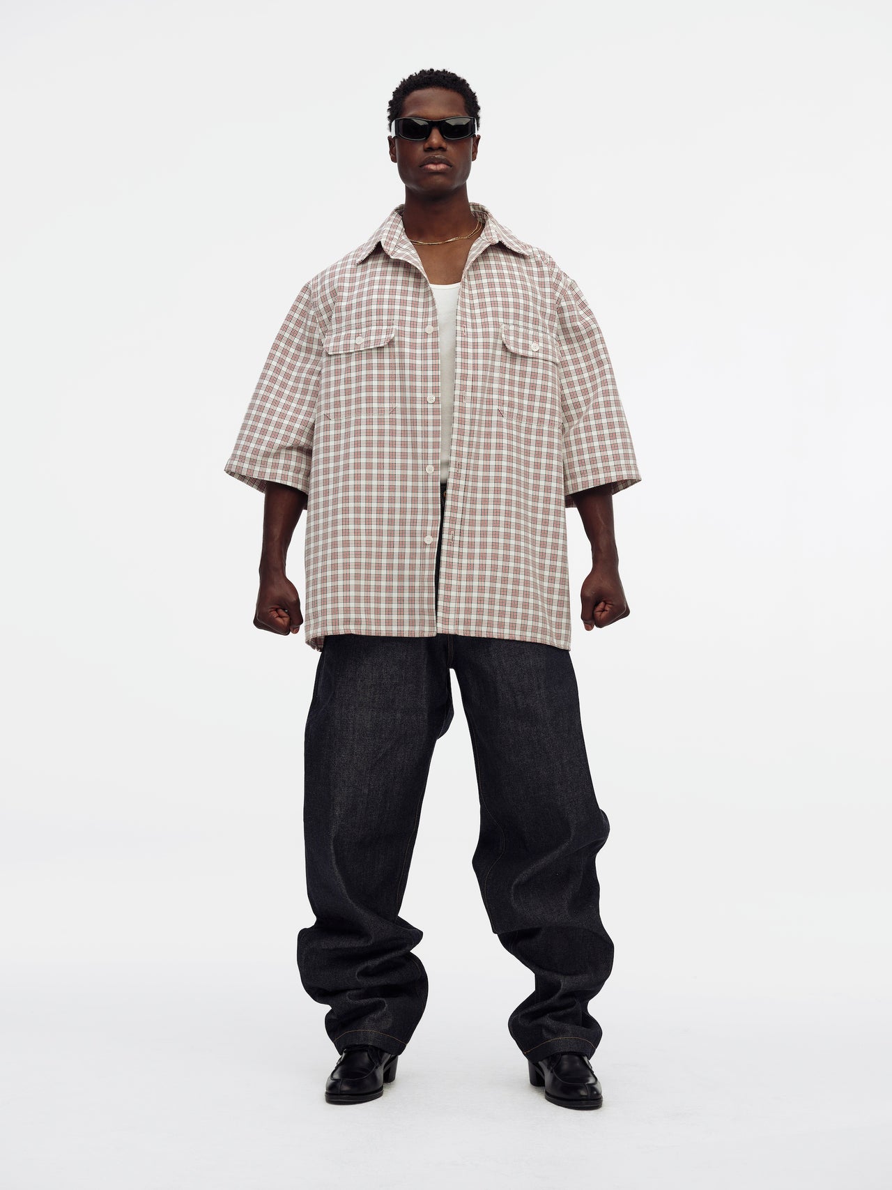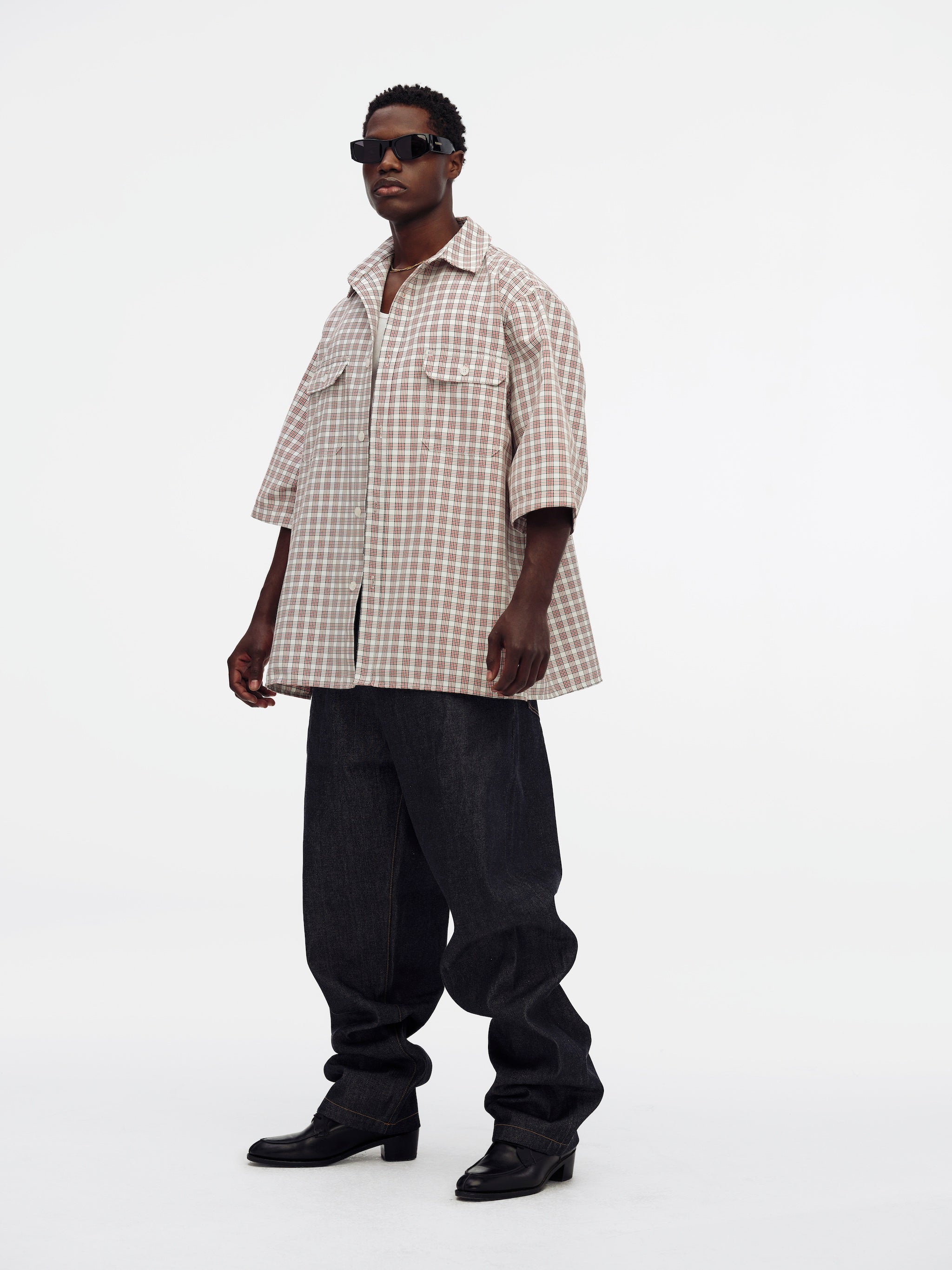 The SS Corcoran Shirt features two patch pockets at the chest with faux horn buttons at the center-front closure and pocket flaps. Designed with a classic collar, short sleeves, and a straight hem, it’s finished with a signature “W” tab at the center back. Cut in a boxy, oversized fit with a sloped, rounded shoulder.